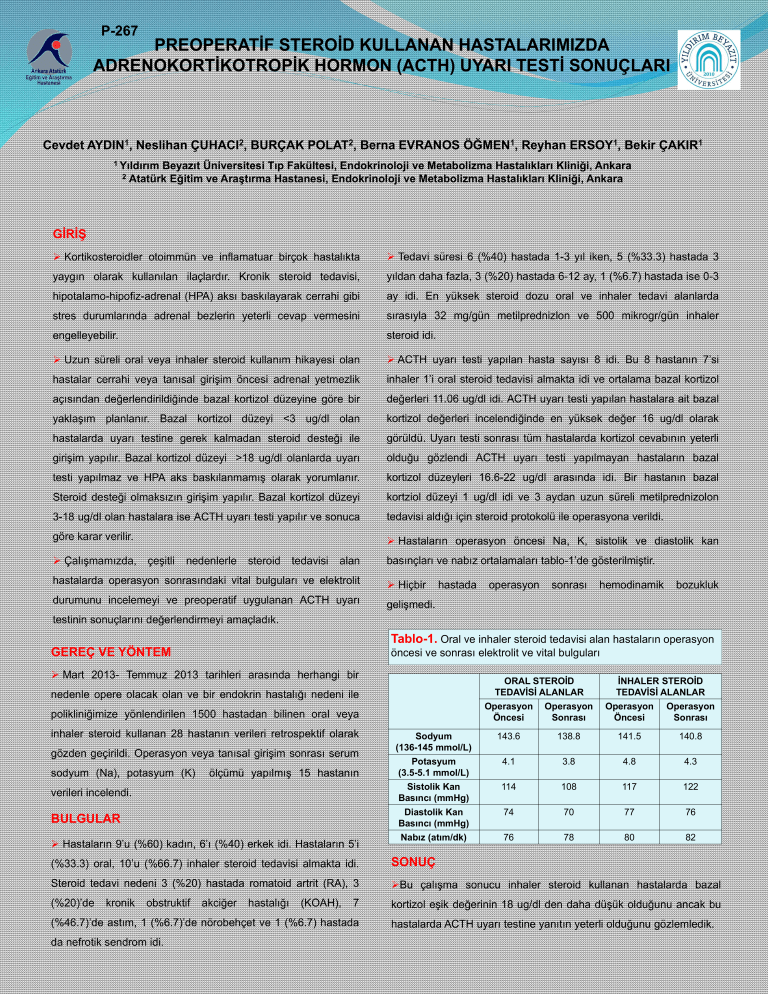 P-267 PREOPERATİF STEROİD KULLANAN HASTALARIMIZDA ADRENOKORTİKOTROPİK HORMON (ACTH) UYARI TESTİ SONUÇLARI Cevdet AYDIN1, Neslihan ÇUHACI2, BURÇAK POLAT2, Berna EVRANOS ÖĞMEN1, Reyhan ERSOY1, Bekir ÇAKIR1 1 Yıldırım Beyazıt Üniversitesi Tıp Fakültesi, Endokrinoloji ve Metabolizma Hastalıkları Kliniği, Ankara 2 Atatürk Eğitim ve Araştırma Hastanesi, Endokrinoloji ve Metabolizma Hastalıkları Kliniği, Ankara GİRİŞ Kortikosteroidler otoimmün ve inflamatuar birçok hastalıkta Tedavi süresi 6 (%40) hastada 1-3 yıl iken, 5 (%33.3) hastada 3 yaygın olarak kullanılan ilaçlardır. Kronik steroid tedavisi, yıldan daha fazla, 3 (%20) hastada 6-12 ay, 1 (%6.7) hastada ise 0-3 hipotalamo-hipofiz-adrenal (HPA) aksı baskılayarak cerrahi gibi ay idi. En yüksek steroid dozu oral ve inhaler tedavi alanlarda stres durumlarında adrenal bezlerin yeterli cevap vermesini sırasıyla 32 mg/gün metilprednizlon ve 500 mikrogr/gün inhaler engelleyebilir. steroid idi. Uzun süreli oral veya inhaler steroid kullanım hikayesi olan ACTH uyarı testi yapılan hasta sayısı 8 idi. Bu 8 hastanın 7’si hastalar cerrahi veya tanısal girişim öncesi adrenal yetmezlik inhaler 1’i oral steroid tedavisi almakta idi ve ortalama bazal kortizol açısından değerlendirildiğinde bazal kortizol düzeyine göre bir değerleri 11.06 ug/dl idi. ACTH uyarı testi yapılan hastalara ait bazal yaklaşım planlanır. Bazal kortizol düzeyi <3 ug/dl olan kortizol değerleri incelendiğinde en yüksek değer 16 ug/dl olarak hastalarda uyarı testine gerek kalmadan steroid desteği ile görüldü. Uyarı testi sonrası tüm hastalarda kortizol cevabının yeterli girişim yapılır. Bazal kortizol düzeyi >18 ug/dl olanlarda uyarı olduğu gözlendi ACTH uyarı testi yapılmayan hastaların bazal testi yapılmaz ve HPA aks baskılanmamış olarak yorumlanır. kortizol düzeyleri 16.6-22 ug/dl arasında idi. Bir hastanın bazal Steroid desteği olmaksızın girişim yapılır. Bazal kortizol düzeyi kortziol düzeyi 1 ug/dl idi ve 3 aydan uzun süreli metilprednizolon 3-18 ug/dl olan hastalara ise ACTH uyarı testi yapılır ve sonuca tedavisi aldığı için steroid protokolü ile operasyona verildi. göre karar verilir. Hastaların operasyon öncesi Na, K, sistolik ve diastolik kan Çalışmamızda, çeşitli nedenlerle steroid tedavisi alan basınçları ve nabız ortalamaları tablo-1’de gösterilmiştir. hastalarda operasyon sonrasındaki vital bulguları ve elektrolit Hiçbir durumunu incelemeyi ve preoperatif uygulanan ACTH uyarı gelişmedi. hastada operasyon sonrası hemodinamik bozukluk testinin sonuçlarını değerlendirmeyi amaçladık. Tablo-1. Oral ve inhaler steroid tedavisi alan hastaların operasyon GEREÇ VE YÖNTEM öncesi ve sonrası elektrolit ve vital bulguları Mart 2013- Temmuz 2013 tarihleri arasında herhangi bir ORAL STEROİD TEDAVİSİ ALANLAR nedenle opere olacak olan ve bir endokrin hastalığı nedeni ile Operasyon Öncesi Operasyon Sonrası Operasyon Öncesi Operasyon Sonrası Sodyum (136-145 mmol/L) Potasyum (3.5-5.1 mmol/L) Sistolik Kan Basıncı (mmHg) 143.6 138.8 141.5 140.8 4.1 3.8 4.8 4.3 114 108 117 122 Diastolik Kan Basıncı (mmHg) Nabız (atım/dk) 74 70 77 76 76 78 80 82 polikliniğimize yönlendirilen 1500 hastadan bilinen oral veya inhaler steroid kullanan 28 hastanın verileri retrospektif olarak gözden geçirildi. Operasyon veya tanısal girişim sonrası serum sodyum (Na), potasyum (K) ölçümü yapılmış 15 hastanın verileri incelendi. BULGULAR Hastaların 9’u (%60) kadın, 6’ı (%40) erkek idi. Hastaların 5’i İNHALER STEROİD TEDAVİSİ ALANLAR (%33.3) oral, 10’u (%66.7) inhaler steroid tedavisi almakta idi. SONUÇ Steroid tedavi nedeni 3 (%20) hastada romatoid artrit (RA), 3 Bu çalışma sonucu inhaler steroid kullanan hastalarda bazal akciğer hastalığı 7 kortizol eşik değerinin 18 ug/dl den daha düşük olduğunu ancak bu (%46.7)’de astım, 1 (%6.7)’de nörobehçet ve 1 (%6.7) hastada hastalarda ACTH uyarı testine yanıtın yeterli olduğunu gözlemledik. (%20)’de kronik obstruktif da nefrotik sendrom idi. (KOAH),