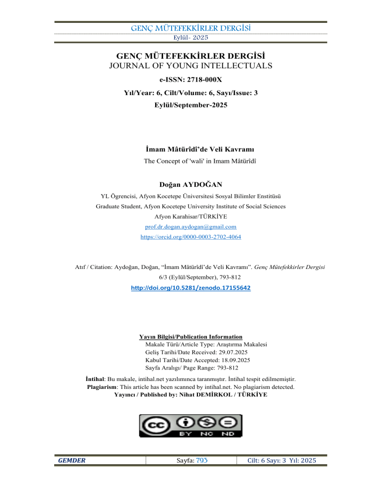 GENÇ MÜTEFEKKİRLER DERGİSİ Eylül- 2025 GENÇ MÜTEFEKKİRLER DERGİSİ JOURNAL OF YOUNG INTELLECTUALS e-ISSN: 2718-000X Yıl/Year: 6, Cilt/Volume: 6, Sayı/Issue: 3 Eylül/September-2025 İmam Mâtürîdî’de Veli Kavramı The Concept of 'wali' in Imam Mâtürîdî Doğan AYDOĞAN YL Ögrencisi, Afyon Kocetepe Üniversitesi Sosyal Bilimler Enstitüsü Graduate Student, Afyon Kocetepe University Institute of Social Sciences Afyon Karahisar/TÜRKİYE prof.dr.dogan.aydogan@gmail.com https://orcid.org/0000-0003-2702-4064 Atıf / Citation: Aydoğan, Doğan, “İmam Mâtürîdî’de Veli Kavramı”. Genç Mütefekkirler Dergisi 6/3 (Eylül/September), 793-812 http://doi.org/10.5281/zenodo.17155642 Yayın Bilgisi/Publication Information Makale Türü/Article Type: Araştırma Makalesi Geliş Tarihi/Date Received: 29.07.2025 Kabul Tarihi/Date Accepted: 18.09.2025 Sayfa Aralıgı/ Page Range: 793-812 İntihal: Bu makale, intihal.net yazılımınca taranmıştır. İntihal tespit edilmemiştir. Plagiarism: This article has been scanned by intihal.net. No plagiarism detected. Yayıncı / Published by: Nihat DEMİRKOL / TÜRKİYE GEMDER Sayfa: 793 Cilt: 6 Sayı: 3 Yıl: 2025 JOURNAL OF YOUNG INTELLECTUALS September- 2025 ÖZET Bu çalışmada, Ehl-i Sünnet’in önemli âlimlerinden olan İmam Mâturîdî’nin, tasavvufta sıkça kullanılan “velî” kavramına nasıl anlamlar yüklediği incelenmiştir. İmam Mâturîdî, Ebu Hanife’nin düşünce geleneğine bağlı bir âlim olarak akıl ve nakli birlikte kullanmış, bu yönüyle hem Ehl-i hadis hem de Mutezile tarafından eleştirilmiştir. Onun tefsir anlayışı rivayete değil dirayete dayanır; yani ayetlerin bağlamı, dil yapısı ve anlam ilişkileri dikkate alınarak yorum yapılır. Araştırmada, İmam Mâturîdî’nin hacimli eseri Te’vîlâtü’l-Kur’ân esas alınarak Kur’an’da geçen “velî” kelimesinin geçtiği tüm ayetler taranmış ve bu kelimenin farklı bağlamlarda kazandığı anlamlar sınıflandırılmıştır. “Velî” kelimesi Kur’an’da 232 yerde geçmekte olup; Allah’a nispet edildiğinde dost, rab, kurtarıcı, yardımcı, ibadet edilen ve koruyucu gibi olumlu anlamlar taşırken, başka varlıklara nispet edildiğinde dost, yardımcı, yakın ya da olumsuz çağrışımlı anlamlara gelebilmektedir. Bu bağlamda İmam Mâturîdî’nin yaklaşımı, kavramın geçtiği her ayetin bağlamına dikkat ederek çok boyutlu bir anlam inşası şeklindedir. Ayrıca Türkçede kullanılan “veli” kavramının, Kur’an’daki karşılıklarıyla birebir örtüşmediği vurgulanmıştır. Anahtar Kelimeler: Veli, İmam Mâtürîdî, Mâtürîdîyye, Dost, Te’vîlâtü’l-Kur’an. GEMDER Sayfa: 794 Cilt: 6 Sayı: 3 Yıl: 2025 GENÇ MÜTEFEKKİRLER DERGİSİ Eylül- 2025 ABSTRACT This study explores how Imām al-Māturīdī, one of the prominent theologians of Ahl alSunna, interpreted the term walī, which is frequently used in Sufi thought. As a follower of the rationalist tradition of Abū Ḥanīfa, Māturīdī combined reason (ʿaql) and transmission (naql) in his theological approach, which led to criticisms both from the Ḥadīth scholars and the Muʿtazilites. His Qur’anic commentary is classified as a dirāyah (analytical) tafsīr rather than a riwāyah (narrative-based) one, meaning he interpreted verses using linguistic and contextual analysis rather than solely relying on transmitted reports. In this research, all occurrences of the term walī in the Qur’an (a total of 232) were analyzed through Māturīdī’s major exegetical work, Taʾwīlāt al-Qurʾān. The meanings were categorized according to their contextual usage. When attributed to God, the term walī conveys meanings such as protector, lord, helper, object of worship, and close ally. However, when ascribed to other beings, it can imply meanings like friend, supporter, or—depending on the context—carry negative connotations. Māturīdī’s treatment of the term is nuanced and context-sensitive, reflecting a sophisticated theological and linguistic methodology. The study also emphasizes that the meaning of walī in the Qur’anic sense differs from its modern Turkish usage. Keywords: Imam Mâtürîdî, Veli, Mâtürîdîism, Taʾwīlāt al-Qurʾān, Protector. GEMDER Sayfa: 795 Cilt: 6 Sayı: 3 Yıl: 2025 JOURNAL OF YOUNG INTELLECTUALS September- 2025 GİRİŞ Veli, mana itibari ile İslam’da önemli kavramlardan biridir. Çünkü İslam’da dostluk, yakınlık özellikle Allah’a ve Resulüne yakınlık dinimiz açısından önemli görünen durumdur. Kur’an-ı Kerimde bolca geçen veli kelimesi, Allah-ü Teala’nın isimlerindendir. Genellikle ayet sonlarında bolca geçen kelimedir. “Veli” ve türevleri olarak toplamda 232 yerde geçmektedir. 24 defa ayetlerde müfret şeklinde gelmiş, 62 defa da cemi olarak gelmiştir. Bizim Türkçemizde çokça kullandığımız isimler arasında bulunmaktadır. Hatta çocuklara isim olarak dahi verilir. Genel anlamı ile de çocuklara dost anlamında bu isim verilir. Tasavvufta bolca kullanılan veli kelimesi, İmam Mâtürîdî’nin günümüze ulaşan eserlerinden derlenerek en yakın anlam olarak dostluk yakınlık gibi anlamları içermektedir. Veli tasavvufta Allah-ü Teala’ya yakın olmak olarak kullanılır. Allah-ü Teala’ya yakın anlamında da veliyullah terimi kullanılır. Allah-ü Teala’ya yakınlığı manevi boyutta yaşayıp, Allah dostu dediğimiz insanlar vardır. Bu kişiler kalp gözleri açık, bizim göremediğimizi gören, duyamadığımızı duyan kişilerdir. Bunlara veli zât deriz. İmam Mâtürîdî’nin (ö.333/944) tefsir kitabı olan Te’vila’tül-Kur’an günümüze ulaşmış olan en önemli eseridir. Dirayet tefsiri olan bu kitapta İmam Mâtürîdî kendi düşüncelerinin yer alığı, Kitab-ı Tevhit’in aksine kendi eli ile yazdığı bir kitap değildir. Öğrencisi Alâeddin es-Semerkandi’nin