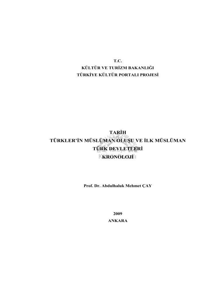 T.C. KÜLTÜR VE TURİZM BAKANLIĞI TÜRKİYE KÜLTÜR PORTALI PROJESİ TARİH TÜRKLER’İN MÜSLÜMAN OLUŞU VE İLK MÜSLÜMAN TÜRK DEVLETLERİ KRONOLOJİ Prof. Dr. Abdulhaluk Mehmet ÇAY 2009 ANKARA 3.4. Kronoloji Anahtar Kelimeler: İlk Müslüman Türk devletleri Karahanlılar, Gazneliler Bilge Kül Kadır Han’ın kendini “Türk Hanları’nın meşrû halefi” sayarak Kara-Han unvanını alması ve Karahanlılar Devleti’nin kurulması 840 Oğulçak Kadır Han’ın başkenti Balasagun şehrinden Kaşgar’a nakletmesi 893 Satuk Buğra Han’ın İslâmiyet’i resmî devlet dini olarak kabul etmesi 920’ye doğru Satuk Buğra Han’ın ölümü 955 Alp Tigin’in ölümü yerine oğlu İshak’ın Gazne Sultanı olması 963 Sebük Tigin’in Gazne Sultanlığı’nı ele geçirmesi ve Yeminî hanedanını kurması 969 Sebük Tigin’in ölümü yerine oğlu İsmail’in Gazne Sultanı olması 997 Sebük Tigin’in diğer oğlu Mahmud’un tahtı ele geçirmesi 997 Karahanlı Hanı Ebû Nasr Ahmed’in Samanoğulları Devleti’ni ortadan kaldırması 999 Maverâünnehir’in Karahanlılar’ın eline geçmesi 1001 Gazneli Sultan Mahmud’un Hint Seferi’ne başlaması 1001 Gazneli Sultan Mahmud’un Harezm’i hâkimiyeti altına alması 1017 Doğu Afganistan’ın Gazneli hâkimiyeti altına girmesi 1020 Gazneli Sultan Mahmud tarafından Güneybatı İran (Irak-ı Acem)’ın fethi 1024 Gazneli Sultan Mahmud’un 17 sefer sonunda Kuzey Hindistan’ın fethini tamamlaması 1027 Gazneli Sultan Mahmud’un ölümü yerine oğlu Mes’ud’ın Sultan olması 1030 Selçuklu Tuğrul ve Çağrı Beyler’in Dandanakan Savaşı’nda Gazneli Sultan Mes’ud’u mağlûp etmeleri 23 Mayıs 1040 Karahanlı Devleti’nin Doğu ve Batı Karahanlı Devleti olarak siyaseten İkiye ayrılması 1042 Yusuf Has Hâcib’in Kutadgu Bilig’i tamamlaması ve eseri Ebû Ali Hasan (Tamgaç Buğra Han)’a takdim etmesi 1069/1070 2 Kaşgarlı Mahmud’un Dîvan-ı Lûgat’it-Türk adlı eserini tamamlayarak Abbasî Halifesi el-Muktedî Billâh’a takdim etmesi 1077 Batı Karahanlı Devleti’nin Büyük Selçuklu Sultanı Melikşâh’ın yüksek hâkimiyetini kabul etmesi 1089 Doğu Karahanlı Devleti’nin Büyük Selçuklu Sultanı Melikşâh’ın yüksek hâkimiyetini tanıması 1090 Doğu Karahanlı Devleti’nin yeniden istiklâline kavuşması 1105 Doğu Karahanlı Devleti’nin Kara-Hıtaylar’ın egemenliği altına girmesi 1133 Büyük Selçuklu Sultanı Sançar’ın Katavan Savaşı’nda Kara Hıtaylar’a yenilmesi ve Batı Karahanlı Devleti’nin Kara-Hıtay hâkimiyetini tanıması 1141 Gazneli Devleti’nin Gurlular tarafından yıkılması 1187 Doğu Karahanlı Devleti’nin yıkılması 1211 Harezmşah Sultanı Alâaddin Muhammed’in son Karahanlı Hanı Osman Han’ı mağlûp ederek Batı Karahanlı Devleti’ne son vermesi 1212 Kaynak (Source): Haklar (Rights): (Telif ve kullanım hakları ile ilgili bilgiler.) 5846 sayılı Fikir ve Sanat Eserleri Kanunu uyarınca hazırlanan tüm içeriğin her türlü ortamda umuma arz yetkisi sınırsız süreyle Kültür Turizm Bakanlığına devredilmiştir. Bakanlık sonraki zamanlarda hazırlanan içerikle ilgili düzeltme, ekleme, silme veya yayından kaldırma hakkına sahiptir. Kaynağı Hazırlayan Konu Editörü Proje Yöneticisi Prof. Dr. Abdulhaluk Prof. Dr. Abdulhaluk Prof. Dr. H. Hale Mehmet ÇAY Mehmet ÇAY KÜNÜÇEN 3