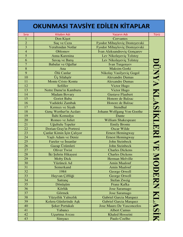 OKUNMASI TAVSİYE EDİLEN KİTAPLAR Sıra Don Kişot Suç ve Ceza Yeraltından Notlar Oblomov Anna Karenina Savaş ve Barış Babalar ve Oğullar Ana Ölü Canlar Üç Silahşör Monte Cristo Kontu Sefiller Notre Dame'ın Kamburu Madam Bovary Goriot Baba Vadideki Zambak Kırmızı ve Siyah Genç Werther'in Acıları İlahi Komedya Romeo ve Juliet Uğultulu Tepeler Dorian Gray'in Portresi Çanlar Kimin İçin Çalıyor Yaşlı Adam ve Deniz Fareler ve İnsanlar Gazap Üzümleri Oliver Twist İki Şehrin Hikayesi Moby Dick Yüzüncü Ad Semerkand 1984 Hayvan Çiftliği Satranç Dönüşüm Körlük Görmek Yüzyıllık Yalnızlık Kolera Günlerinde Aşk Şeker Portakalı Yabancı Uçurtma Avcısı Simyacı Yazarın Adı Cervantes Fyodor Mihayloviç Dostoyevski Fyodor Mihayloviç Dostoyevski İvan Aleksandroviç Gonçarov Lev Nikolayeviç Tolstoy Lev Nikolayeviç Tolstoy Ivan Turgenyev Maksim Gorki Nikolay Vasilyeviç Gogol Alexandre Dumas Alexandre Dumas Victor Hugo Victor Hugo Gustave Flaubert Honore de Balzac Honore de Balzac Stendhal Johann Wolfgang Von Goethe Dante William Shakespeare Emily Bronte Oscar Wilde Ernest Hemingway Ernest Hemingway John Steinbeck John Steinbeck Charles Dickens Charles Dickens Herman Melville Amin Maalouf Amin Maalouf George Orwell George Orwell Stefan Zweig Franz Kafka Jose Saramago Jose Saramago Gabriel Garcia Marquez Gabriel Garcia Marquez Jose Mauro De Vasconcelos Albert Camus Khaled Hosseini Paulo Coelho Türü DÜNYA KLASİKLERİ VE MODERN KLASİKLER 1 2 3 4 5 6 7 8 9 10 11 12 13 14 15 16 17 18 19 20 21 22 23 24 25 26 27 28 29 30 31 32 33 34 35 36 37 38 39 40 41 42 43 Kitabın Adı Paulo Coelho Chris Cleave Christy Brown Marlo Morgan Cengiz Aytmatov Cengiz Aytmatov Cengiz Aytmatov Harper Lee Erich Maria Remarque Şehbenderzade Filibeli Ahmed Hilmi TÜRK EDEBİY KLAS Şemseddin Sami Samipaşazade Sezai Namık Kemal Namık Kemal Nabizade Nazım Recaizade Mahmut Ekrem Ahmet Mithat Efendi Mehmet Rauf Halit Ziya Uşaklıgil Halit Ziya Uşaklıgil Hüseyin Rahmi Gürpınar Hüseyin Rahmi Gürpınar Hüseyin Rahmi Gürpınar Yakup Kadri Karaosmanoğlu Yakup Kadri Karaosmanoğlu Yakup Kadri Karaosmanoğlu Yakup Kadri Karaosmanoğlu Reşat Nuri Güntekin Reşat Nuri Güntekin Reşat Nuri Güntekin Halide Edib Adıvar Halide Edib Adıvar Halide Edib Adıvar Halide Edib Adıvar Halide Edib Adıvar Refik Halid Karay Falih Rıfkı Atay Peyami Safa Peyami Safa Ahmet Hamdi Tanpınar Ahmet Hamdi Tanpınar Ahmet Hamdi Tanpınar Halikarnas Balıkçısı Memduh Şevket Esendal Sait Faik Abasıyanık Yusuf Atılgan Yusuf Atılgan TÜRK EDEBİYATI KLASİKLERİ Beşinci Dağ Küçük Arı Sol Ayağım Bir Çift Yürek Gün Olur Asra Bedel Cemile Elveda Gülsarı Bülbülü Öldürmek Batı Cephesinde Yeni Bir Şey Yok Dede Korkut Hikayeleri Amak-ı Hayal Taaşşuk-ı Talat ve Fitnat Sergüzeşt Cezmi İntibah Karabibik Araba Sevdası Felatun Bey İle Rakım Efendi Eylül Aşk-ı Memnu Mai ve Siyah Kuyrukluyıldız Altında Bir İzdivaç Mürebbiye Gulyabani Kiralık Konak Sodom ve Gomore Yaban Nur Baba Çalıkuşu Yeşil Gece Acımak Yol Palas Cinayeti Sinekli Bakkal Ateşten Gömlek Türkün Ateşle İmtihanı Vurun Kahpeye Memleket Hikayeleri Çankaya Fatih-Harbiye 9. Hariciye Koğuşu Huzur Saatleri Ayarlama Enstitüsü Beş Şehir Mavi Sürgün Ayaşlı ve Kiracıları Medarı Maişet Motoru Anayurt Oteli Aylak Adam ASİKLER 44 45 46 47 48 49 50 51 52 53 54 55 56 57 58 59 60 61 62 63 64 65 66 67 68 69 70 71 72 73 74 75 76 77 78 79 80 81 82 83 84 85 86 87 88 89 90 91 TARİH Yusuf Atılgan Tarık Buğra Tarık Buğra Tarık Buğra Kemal Tahir Kemal Tahir Kemal Tahir Kemal Tahir Sabahattin Ali Sabahattin Ali Ferit Edgü Aziz Nesin Aziz Nesin Yaşar Kemal Yaşar Kemal Yaşar Kemal Yaşar Kemal Yaşar Kemal Yaşar Kemal Yaşar Kemal Yaşar Kemal Yaşar Kemal Necati Cumalı Vedat Türkali Orhan Kemal Orhan Kemal Orhan Kemal Rıfat Ilgaz Rıfat Ilgaz Rıfat Ilgaz Rıfat Ilgaz Mahmut Makal Attila İlhan Kemal Bilbaşar Abbas Sayar MUSTAFA KEMAL ATATÜRK Yuval Noah Harari Emrah Safa Gürkan Emrah Safa Gürkan Prof. Dr. İlber Ortaylı Prof. Dr. İlber Ortaylı Şevket Süreyya Aydemir Şevket Süreyya Aydemir Turgut Özakman Grigory Petrov TÜRK EDEBİYATI MODERN KLASİKLER Canistan Osmancık Küçük Ağa Küçük Ağa Ankara'da Devlet Ana Esir Şehrin İnsanları Esir Şehrin Mahpusu Yol Ayrımı Kürk Mantolu Madonna Kuyucaklı Yusuf Hakkâri’de Bir Mevsim Zübük Yaşar Ne Yaşar Ne Yaşamaz İnce Memed Teneke Yılanı Öldürseler Demirciler Çarşısı Cinayeti Ortadirek Yer Demir Gök Bakır Ölmez Otu Deniz Küstü Kuşlar da Gitti Tütün Zamanı Bir Gün Tek Başına Murtaza Baba Evi Gurbet Kuşları Karartma Geceleri Halime Kaptan Pijamalılar Hababam Sınıfı Bizim Köy Gazi Paşa Cemo Yılkı Atı NUTUK Hayvanlardan Tanrılara - Sapiens Sultanın Korsanları Bunu Herkes Bilir Türklerin Tarihi Gazi Mustafa Kemal Atatürk Tek Adam (3 Cilt) İkinci Adam (3 Cilt) Şu Çılgın Türkler Beyaz Zambaklar Ülkesinde TÜRK EDEBİYATI MODERN KLASİKLER 92 93 94 95 96 97 98 99 100 101 102 103 104 105 106 107 108 109 110 111 112 113 114 115 116 117 118 119 120 121 122 123 124 125 126 127 128 129 130 131 132 133 134 135 136