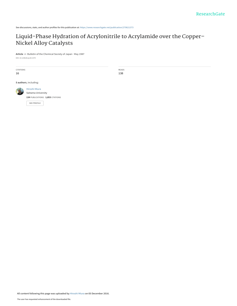 See discussions, stats, and author profiles for this publication at: https://www.researchgate.net/publication/270621373 Liquid-Phase Hydration of Acrylonitrile to Acrylamide over the Copper– Nickel Alloy Catalysts Article in Bulletin of the Chemical Society of Japan · May 1987 DOI: 10.1246/bcsj.60.1579 CITATIONS READS 16 138 5 authors, including: Hiroshi Miura Saitama University 134 PUBLICATIONS 1,853 CITATIONS SEE PROFILE All content following this page was uploaded by Hiroshi Miura on 05 December 2016. The user has requested enhancement of the downloaded file. View publication stats