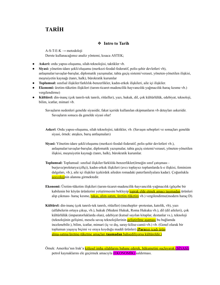 TARİH ❖ Intro to Tarih A-S-T-E-K → metodoloji Derste kullanacağımız analiz yöntemi, kısaca ASTEK; ● Askeri: ordu yapısı-oluşumu, silah-teknolojisi, taktikler vb. ● Siyasi: yönetim-idare şekli/oluşumu (merkezi-feodal-federatif, polis-şehir devletleri vb), anlaşmalar/savaşlar-barışlar, diplomatik yazışmalar, tahta geçiş sistemi/veraset, yöneten-yönetilen ilişkisi, meşruiyetin kaynağı (tanrı, halk), bürokratik kurumlar ● Toplumsal: sınıfsal ilişkiler/farklılık-benzerlikler, kadın-erkek ilişkileri, aile içi ilişkiler. ● Ekonomi: üretim-tüketim ilişkileri (tarım-ticaret-madencilik-hayvancılık-yağmacılık-haraç kesme vb.) vergilendirme) ● Kültürel: din-inanç (çok tanrılı-tek tanrılı, ritüeller), yazı, hukuk, dil, çok kültürlülük, edebiyat, teknoloji, bilim, icatlar, mimari vb. Savaşların nedenleri genelde siyasidir, fakat içeride kullanılan ekipmanların vb detayları askeridir. Savaşların sonucu da genelde siyasi olur! Askeri: Ordu yapısı-oluşumu, silah teknolojisi, taktikler, vb. (Savaşın sebepleri ve sonuçları genelde siyasi, örnek: ateşkes, barış antlaşmaları) Siyasi: Yönetim-idare şekli/oluşumu (merkezi-feodal-federatif, polis-şehir devletleri vb.), anlaşmalar/savaşlar-barışlar, diplomatik yazışmalar, tahta geçiş sistemi/veraset, yöneten-yönetilen ilişkisi, meşruiyetin kaynağı (tanrı, halk), bürokratik kurumlar. Toplumsal: Toplumsal: sınıfsal ilişkiler/farklılık-benzerlikler(örneğin sınıf çatışması burjuva/proletarya/çiftçi), kadın-erkek ilişkileri (avcı toplayıcı toplumlarda k-e ilişkisi, feminizm dalgaları, vb.), aile içi ilişkiler (çekirdek aileden romadaki paterfamilyalara kadar). Çoğunlukla sosyolojinin alanına girmektedir. Ekonomi: Üretim-tüketim ilişkileri (tarım-ticaret-madencilik-hayvancılık-yağmacılık (göçebe bir kabilenin bir köyün ürünlerini yetiştirmesini bekleyip toprak elde etmek amacı taşımadan ürünleri alıp çıkması- haraç kesme, takas, alım-satım, üretim-tüketim vb.) vergilendirme(modern haraç:D). Kültürel: din-inanç (çok tanrılı-tek tanrılı, ritüeller) (mezhepler–protestan, katolik, vb), yazı (alfabelerin ortaya çıkışı, vb.), hukuk (Medeni Hukuk, Roma Hukuku vb.), dil (dil aileleri), çok kültürlülük (imparatorluklarda olan), edebiyat (kutsal sayılan kitaplar, destanlar vs.), teknoloji (teknolojinin gelişimi, mesela savaş teknolojilerinin geliştirilme aşaması bu bağlamda incelenebilir.), bilim, icatlar, mimari (iç ve dış, saray-kilise-camii-vb.) vb. (Genel olarak bir toplumun yaşayış biçimi ve oraya koyduğu maddi ürünler) (Paranın icadı ürün alma-satma/üretme-tüketme amaçları taşımadan bahsediliyorsa kültüreldir.) Örnek: Amerika’nın Irak’a kitlesel imha silahlarını bahane ederek, hükumetini suçlayarak (SİYASİ) petrol kaynaklarını ele geçirmek amacıyla (EKONOMİK) saldırması. CYRIL AYDON V. BÖLÜM DEVLETİN İCADI Uygarlık: ● Biz ve ötekiler dışında bir uygarlık tanımı var mı? ● Aydon yapıyor: ○ Geniş bir bölgeye yayılan, uzun süre hayatta kalan, özgün bir şehir yaşamı olan kültürdür. ● MEZOPOTAMYA; ● Diğerlerine göre en eskisi, uygarlık beşiği, yazı icadı ● Sulama, kurak mevsimde su kanalları ve hazneleri-depoları yapılması için organizasyon ve insana ihtiyaç var ○ => Yöneticiler tarafından ilahi gücün öne sürülmesi vs. ● Örgütlü devletler mi yoksa büyük ölçekli sulama mı önce geldi sorunsalı? ● Planlama, işgücü idaresi projeler büyüdükçe önem kazandı: ○ Liderlik gerekiyor, komuta kademesi/yapısı ilk devletlerin doğuşunu ortaya çıkarıyor. ○ Sümerlerin yaşadığı yerlerde şehir devleti örgütlenmesi-yazı ilişkisi ○ Kil madalyonlar-tabletler-muhasebe kayıtları-piktokgrafik yazılar, mesela 2 inek :) ○ Piktografik yazı -> Hiyeratik yazı ○ MÖ 3000 gibi temsil ettiği nesnelere benzemeyen kalabalık bir kelime dağarcığı oluştu ○ Muhasebe matematiği, yani basit sembolleri doğurdu. ○ Yazılı dil oluştu (kayıt tutmak ve gelecek nesillere bilgi aktarımı yapmak amaçlı), kil tabletlere kamışla yazılan çivi benzeri bir yazı. Müzelerde binlerce örnek var. ○ Çift eklemli dil: → yazı + konuşma Muazzez İlmiye Çığır (sigma kadın bilim insanı)=> tapınak başörtülü fahişeleri 15 Eylül 2025 Sümerler ❖ Şehir devletleri; ➢ Uruk Şehri, 50 bin nüfus, surlarla çevrili, organize, soyluların seçtiği bir kral var, tanrılara aracılık ederek konumunu güçlendiriyor. ➢ Profesyonel ordu yok ➢ Bölgede başka şehirler de var; rekabet var (toprak, su , doğal kaynaklar vb.) ve savaşlara neden olmaya başlıyor, bir süre sonra savaşmaya hazır birlikleri olan, etrafı surlarla çevrili şehir devletlerine dönüşecekler. ➢ Bir kere savaş olunca barış günlerindeki sıradan etkinlikler ikinci plana geriliyor, savaşı idare edecek birisi kral oluyor, belki bir rahip. Havalı Sümer Şehirleri Bilimsel Gelişmeler; ➢ Çömlekçi çarkı - tekerlek ilişkisi ➢ En eski örnek 4 tekerlekli, mö 3500 civarı ➢ Eşek arabaları Tarımsal Artı Ürün (üretilen-tüketilen = kalan = tarımsal artı ürün) : ➢ Tanrılara hediye olarak sunulmak üzere tapınağa gider ➢ Yöneticiler lüks ve şatafatlı yaşar ➢ Metal işçilerinin altın, gümüş, bakır işlemeleri için tam zamanlı çalışmalarına olanak sağlar ➢ Deniz-nehir yoluyla metal ticareti yapılır ➢ Üretilen her şeyin bir kısmı saraya verilir. Muhasebe; ➢ Alınan malzemeler, tamamlanan işler tutulur. ➢ Para kullanılmıyor, ticaret takasla yapılıyor, emek karşılığı yemek, içki ya da barınak oluyor. ● Bir imparator beliriyor; ○ MÖ. 2500’lerde Uruk ve Lagaş gibi kentlerin nüfusu 200 binlere yükseliyor ve kaynaklar üzerinde anlaşılmazlıklar artıyor. ○ MÖ. 2350’de Umma şehri kra
