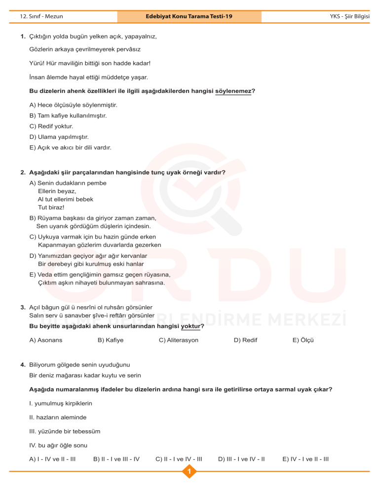 YKS Şiir Bilgisi Konu Tarama Testi - 12. Sınıf