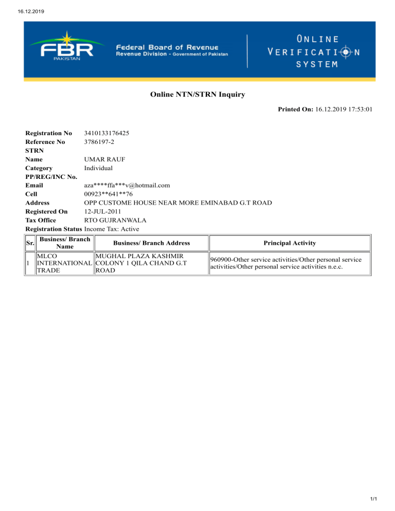 16.12.2019 Online NTN/STRN Inquiry Printed On: 16.12.2019 17:53:01 Registration No 3410133176425 Reference No 3786197-2 STRN Name UMAR RAUF Category Individual PP/REG/INC No. Email aza****ffa***v@hotmail.com Cell 00923**641**76 Address OPP CUSTOME HOUSE NEAR MORE EMINABAD G.T ROAD Registered On 12-JUL-2011 Tax Office RTO GUJRANWALA Registration Status Income Tax: Active Sr. 1 Business/ Branch Business/ Branch Address Name MLCO MUGHAL PLAZA KASHMIR INTERNATIONAL COLONY 1 QILA CHAND G.T TRADE ROAD Principal Activity 960900-Other service activities/Other personal service activities/Other personal service activities n.e.c. 1/1