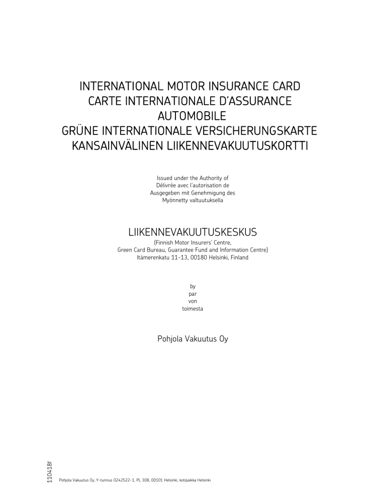 INTERNATIONAL MOTOR INSURANCE CARD CARTE INTERNATIONALE D’ASSURANCE AUTOMOBILE GRÜNE INTERNATIONALE VERSICHERUNGSKARTE KANSAINVÄLINEN LIIKENNEVAKUUTUSKORTTI Issued under the Authority of Délivrée avec l’autorisation de Ausgegeben mit Genehmigung des Myönnetty valtuutuksella LIIKENNEVAKUUTUSKESKUS (Finnish Motor Insurers’ Centre, Green Card Bureau, Guarantee Fund and Information Centre) Itämerenkatu 11-13, 00180 Helsinki, Finland by par von toimesta 110418f Pohjola Vakuutus Oy Pohjola Vakuutus Oy, Y-tunnus 0242522-1, PL 308, 00101 Helsinki, kotipaikka Helsinki Liikennevakuutus ETA-maissa Euroopan talousalueen (ETA) maissa aiheutunut liikennevahinko korvataan pääsääntöisesti näissä maissa voimassa olevien säännösten mukaan. ETA-valtioista liikennevakuutuksella katetaan kuljettajan omat henkilövahingot Suomen lisäksi vain Ruotsin ja Norjan liikennevakuutuslain-säädännön perusteella. Suomessa asuva vahinkoa kärsinyt voi kuitenkin valita, että Suomen liikennevakuutuslain mukaan vakuutetun ajoneuvon aiheuttama ja muualla ETA-alueella kuin Suomessa sattunut henkilövahinko korvataan Suomen lain mukaan silloinkin, kuin vahinko lainvalintaa koskevien säännösten mukaan tulisi korvattavaksi tapahtumamaan mukaan. ETA-maat ovat: Alankomaat, Belgia, Bulgaria, Espanja, Irlanti, Islanti, Italia, Itävalta, Kreikka, Kroatia, Kypros, Latvia, Liechtenstein, Liettua, Luxemburg, Malta, Norja, Portugali, Puola, Ranska, Romania, Ruotsi, Saksa, Slovakia, Slovenia, Suomi, Tanska, Tšekki, Unkari ja Viro. Muut vihreän kortin maat Muissa kuin ETA-maissa vahingon sattuessa korvausvelvollisuus määräytyy yksinomaan tapahtumamaan säännösten mukaan. Näissä maissa ei liikennevakuutuksesta korvata vahingon aiheuttaneen ajoneuvon kuljettajan henkilövahinkoa. Useissa maissa korvaustaso on alhainen ja vahingon aiheuttaja voi joutua vahingosta henkilökohtaiseen taloudelliseen vastuuseen. Liikennevakuutusturvan ollessa suppeampi, on ETAmaiden ulkopuolelle lähtevien aiheellista harkita lisävakuutuksen ottamista. Liikennevakuutus ei korvaa oman ajoneuvon vahinkoja Tässä liikennevakuutuskortissa mainittua ajoneuvoa kohdannut vahinko ei sisälly tämän vakuutuksen korvauspiiriin. Näitä vahinkoja varten voi ottaa vapaaehtoisen autovakuutuksen (kasko). Toimenpiteet vahingon tapahduttua 1 2 3 4 5 Henkilövahingon sattuessa ota yhteys paikalliseen hätäkeskukseen. Kirjaa osapuolten yhteystiedot (omistajan/haltijan, kuljettajan sekä mahdollisten todistajien nimi, osoite, puhelinnumero, sähköposti) sekä ajoneuvon yksilöintitiedot (merkki, malli, rekisterinumero, kansallisuus). Jos vahingossa on osallisena ulkomaalainen ajoneuvo, ota valokuva tai kopio kansainvälisestä liikennevakuutuskortista. Tee vahinkoilmoitus, johon kirjataan vahingon tapahtumatiedot ja osallisten yhteystiedot allekirjoituksineen. Jos tapahtumainkulusta on epäselvyyttä, kunkin osapuolen on syytä tehdä oma vahinkoilmoitus. Vahinkoilmoituksen liitteeksi laitetaan kopio poliisiraportista, jos tällainen on tehty. Vahingon käsittelystä löydät lisätietoa Liikennevakuutuskeskuksen verkkosivuilta www.lvk.fi. OHJE ULKOMAISELLE VAHINGONKÄRSINEELLE VAHINGON SATUTTUA ADVICE TO FOREIGN INJURED IN CASE OF AN ACCIDENT INSTRUCTIONS POUR LES NON-RÉSIDENTS VICTIMES D’UN ACCIDENT DE LA CIRCULATION ANWEISUNGEN FÜR AUSLÄNDISCHE GESCHÄDIGTE NACH EINEM VERKEHRSUNFALL ИНСТРУКЦИИ ДЛЯ ПОСТРАДАВШЕГО ДОРОЖНО-ТРАНСПОРТНОГО ПРОИСШЕСТВИЯ INSTRUCCIONES AL SINIESTRADO EXTRANJERO AL OCURRIR UN ACCIDENTE DE TRÁFICO ISTRUZIONI PER STRANIERI CHE SUBISCONO DANNI A CAUSA DI INCIDENTI STRADALI Tämä moottoriajoneuvo on vakuutettu Suomessa. Mahdolliset korvausvaatimuksenne käsittelee liikennevakuutuskortissa mainittu toimisto edellyttäen, että tapahtumamaan liikennevakuutuslain mukaan olette oikeutettu korvaukseen. This motor vehicle is insured in Finland. The Bureau mentioned in this card will deal with your eventual claims provided you are entitled to compensation according to the Motor Insurance legislation in force in the country where the traffic accident has occurred. Ce véhicule à moteur a été assuré en Finlande. Vos réclamations éventuelles seront traitées par l’office mentionné sur la carte d’assurance automobile à condition que vous ayez droit à une indemnisation en vertu de la loi relative à l’assurance automobile. Dieses Kraftfahrzeug ist in Finnland versichert. Ihre möglichen Entschädigungsansprüche werden von der in der Kfz-Versicherungskarte genannten Stelle bearbeitet, sofern Sie Anspruch auf eine Entschädigung nach dem Kfz-Haftpflichtversicherungsgesetz des jeweiligen Landes haben, in dem sich der Vorfall ereignet hat. Данное транспортное средство застраховано в Финляндии. Ваши возможные требования о возмещении убытков будут рассмотрены в бюро, указанном в карточке автострахования, при условии, что вы имеете право на компенсацию в соответствии с законодательством о страховании транспортных средств страны возникновения происшествия. Este vehículo de motor está asegurado en Finlandia. Sus posibles peticiones de indemnización serán tratadas por la oficina mencionada en la tarjeta de seguro de tráfico requiriendo que de acuerdo con la legislación sobre seguros de tráfico del país donde ocurrió el accidente Usted tiene el derecho a recibir una indemnización. Quest’autovettura è assicurata in Finlandia. La vostra richiesta di risarcimento danni sarà trattata dalla società assicurativa indicata nella polizza del veicolo e se, ai sensi del codice della strada, siete intitolati al versamento di un eventuali risarcimento. FIN-36 / 36-104353687-7-1 FLY Taks