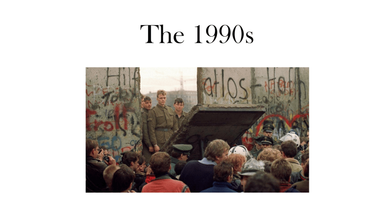 The 1990s George H.W. Bush and the fall of the Soviet Union • Bush elected (1988) on Reagan’s record • Communism crumbles in Europe, 198991 • Consumer goods, personal freedom, rock ‘n’ roll • Berlin Wall falls, Dec. 1989 • Soviet Union disintegrates, 1990-91 • Economic decline, Afghanistan war • Mikhail Gorbachev: reform, not repression • Russia becomes a fragile democracy The Gulf War • Iraq (Saddam Hussein) invades Kuwait, 1990 • Bush organizes worldwide opposition • Decisive military victory • Massive air strikes, then 3-day ground war • Bush approval ratings near 90% • Limited objective: liberate Kuwait (not occupy Iraq) • “New World Order”: U.S. as sole superpower Bill Clinton • Few Democrats willing to challenge Bush in 1992 • Clinton: strong communicator • Avoids social issues • Middle class prosperity • Bush: hurt by recession and tax increase • Clinton wins (1992) and governs as a moderate • Scales back Reagan’s tax cuts for wealthy • Cuts spending Clinton attempts universal health coverage • Efficiency • Health costs consume 15% of U.S. wealth versus around 10% in other countries • Reduce drug costs, redundant jobs, etc. • Strong support for reform • Political failure • Appoints wife Hillary Clinton to manage proposal • Lobbying from insurance companies • Lack of consultation Clinton as moderate • Works with Republicans • Welfare reform • 15 million to 3 million recipients • Maximum 5 years of benefits • Must seek job • Greater state control • North American Free Trade Agreement (NAFTA) • Free trade deals: U.S. as hub of global economy • But local economic difficulty Tech boom, climate change, and “the end of history” • Tech: medical, electronics • Internet • Most benefit to top earners, best-educated • Climate change becomes major national issue • Better computerized climate modeling wide scientific consensus • Oil company opposition • Alarmists hurt credibility • Kyoto Conference: U.S. and poorer countries cannot agree to limit emissions Race / “End of history” • L.A. riots (1992) & O.J. Simpson • Gangsta rap • Growth of black middle class • Latinos become largest minority group in 1990s • Reagan: amnesty for 3 million illegal immigrants • But growing opposition to immigration • “End of history” • Communism defeated • Triumphant American model: democratic government, personal freedom, free markets Sept. 11 2001 and after Bush vs. Gore • Clinton leaves office with high popularity • Al Gore (Clinton vice president) vs. • George W. Bush (Texas governor) • Centrist vs. centrist • Too close to call in Florida • Punch-card ballots • Florida officials end recount • Supreme Court decides to end recount • 5 in favor, 4 opposed Sept. 11, 2001 • Bush/FBI/CIA miss early hints of possible attack • 19 hijackers • 4 airliners • 2 hit World Trade Center towers • 1 hits Pentagon • 1 crashes in rural Pennsylvania after passenger resistance • Bush attacks Taliban regime in Afghanistan • Pursuit of Osama bin Laden Iraq War and after • Bush administration targets Iraq, 2003 • Alleged support for terrorism …and “weapons of mass destruction” • Bush declares victory after capture of Hussein …but uncovers no evidence of anti-U.S. plans or terror weapons • Most U.S. deaths after declaration of victory • Bush barely defeats John Kerry, 2004 • Bush supporters question Kerry’s Vietnam record • By 2008, Bush very unpopular • Barack Obama as “change candidate” & symbol of racial progress