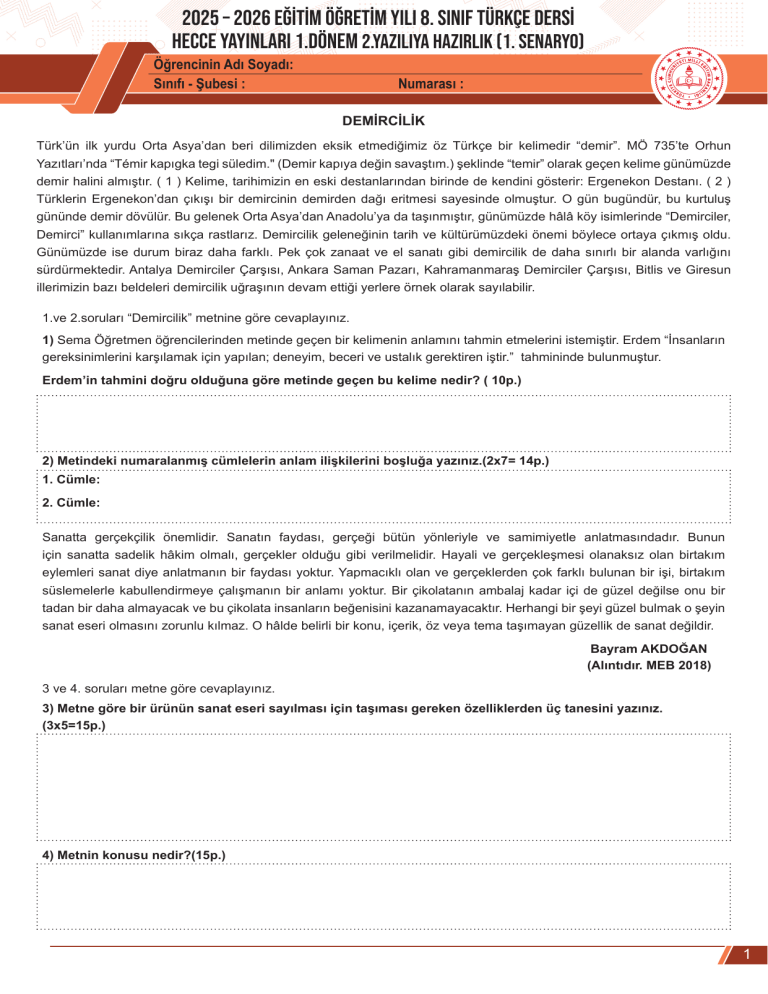 2025 – 2026 EĞİTİM ÖĞRETİM YILI 8. SINIF TÜRKÇE DERSİ HECCE YAYINLARI 1.DÖNEM 2.YAZILIYA HAZIRLIK (1. SENARYO) Öğrencinin Adı Soyadı: Sınıfı - Şubesi : Numarası : DEMİRCİLİK Türk’ün ilk yurdu Orta Asya’dan beri dilimizden eksik etmediğimiz öz Türkçe bir kelimedir “demir”. MÖ 735’te Orhun Yazıtları’nda “Témir kapıgka tegi süledim." (Demir kapıya değin savaştım.) şeklinde “temir” olarak geçen kelime günümüzde demir halini almıştır. ( 1 ) Kelime, tarihimizin en eski destanlarından birinde de kendini gösterir: Ergenekon Destanı. ( 2 ) Türklerin Ergenekon’dan çıkışı bir demircinin demirden dağı eritmesi sayesinde olmuştur. O gün bugündür, bu kurtuluş gününde demir dövülür. Bu gelenek Orta Asya’dan Anadolu’ya da taşınmıştır, günümüzde hâlâ köy isimlerinde “Demirciler, Demirci” kullanımlarına sıkça rastlarız. Demircilik geleneğinin tarih ve kültürümüzdeki önemi böylece ortaya çıkmış oldu. Günümüzde ise durum biraz daha farklı. Pek çok zanaat ve el sanatı gibi demircilik de daha sınırlı bir alanda varlığını sürdürmektedir. Antalya Demirciler Çarşısı, Ankara Saman Pazarı, Kahramanmaraş Demirciler Çarşısı, Bitlis ve Giresun illerimizin bazı beldeleri demircilik uğraşının devam ettiği yerlere örnek olarak sayılabilir. 1.ve 2.soruları “Demircilik” metnine göre cevaplayınız. 1) Sema Öğretmen öğrencilerinden metinde geçen bir kelimenin anlamını tahmin etmelerini istemiştir. Erdem “İnsanların gereksinimlerini karşılamak için yapılan; deneyim, beceri ve ustalık gerektiren iştir.” tahmininde bulunmuştur. Erdem’in tahmini doğru olduğuna göre metinde geçen bu kelime nedir? ( 10p.) 2) Metindeki numaralanmış cümlelerin anlam ilişkilerini boşluğa yazınız.(2x7= 14p.) 1. Cümle: 2. Cümle: Sanatta gerçekçilik önemlidir. Sanatın faydası, gerçeği bütün yönleriyle ve samimiyetle anlatmasındadır. Bunun için sanatta sadelik hâkim olmalı, gerçekler olduğu gibi verilmelidir. Hayali ve gerçekleşmesi olanaksız olan birtakım eylemleri sanat diye anlatmanın bir faydası yoktur. Yapmacıklı olan ve gerçeklerden çok farklı bulunan bir işi, birtakım süslemelerle kabullendirmeye çalışmanın bir anlamı yoktur. Bir çikolatanın ambalaj kadar içi de güzel değilse onu bir tadan bir daha almayacak ve bu çikolata insanların beğenisini kazanamayacaktır. Herhangi bir şeyi güzel bulmak o şeyin sanat eseri olmasını zorunlu kılmaz. O hâlde belirli bir konu, içerik, öz veya tema taşımayan güzellik de sanat değildir. Bayram AKDOĞAN (Alıntıdır. MEB 2018) 3 ve 4. soruları metne göre cevaplayınız. 3) Metne göre bir ürünün sanat eseri sayılması için taşıması gereken özelliklerden üç tanesini yazınız. (3x5=15p.) 4) Metnin konusu nedir?(15p.) 1 ATATÜRK ve TÜRKÇE Dil toplumu millet yapan, bireyleri kaynaştırıp ortak bir kültür yaratan en önemli unsurlardandır. Mustafa Kemal ATATÜRK dili çok önemsemiş ve henüz Kurtuluş Savaşı sürerken çalışmalarına başlamıştır. Bir konuşmasında “Üç buçuk sene süren bu mücadeleden sonra, bilim bakımından, eğitim bakımından mücadelemize devam edeceğiz ve eminim ki bunda da başarılı olacağız.” demiştir. Bu mücadele çerçevesinde birçok çalışma yapılmıştır. Dilimizin yabancı sözcüklerden arındırılması ve sadeleştirilmesine yönelik çalışmalarının sonrasında yeni Türk alfabesi kabul edilmiştir. 1926’da kurulan Dil Heyeti, Türkçe Sözlük ve yirmi beş bin sözcükten oluşan bir İmla Kılavuzu yayımlamıştır. 12 Temmuz 1932’de Türk Dil Kurumunu kurmuş, 1932-1936 yıllarında dil ile ilgili kurultaylar toplamış ve dilimizin köklerinin, zenginliklerinin araştırılıp sistemli hale getirilmesi için çalışılmıştır. 5) Metnin türünün ne olduğunu nedenini açıklayarak belirtiniz.(15p.) 6) Soruları yönergeler doğrultusunda cevaplayınız. a)Aşağıdaki cümleyi ögelerine ayırınız. (8p.) Kocaelispor taraftarı takımına verdiği olağanüstü destekle Türk basınında ilgi gördü. b) Yukarıdaki cümlenin öge dizilişine eş değer farklı bir cümle yazınız. (8p.) 7) (1)Tarih, insanlığın geçmişte bıraktığı izleri anlamamıza yardım eden önemli bir bilim dalıdır. (2)Geçmişten bugüne ulaşan belgeler, olayların nasıl şekillendiğine dair bize güçlü ipuçları verir.(3)Tarih araştırmaları insanı hem düşündürür hem de yeni bakış açıları kazandırır. (4)Tarih bilmek, kültürel gelişimin izlerini görmek açısından oldukça değerlidir. (5) Ancak herkes tarih okumayı sevmez. Paragraftaki (5x3=15p.) İsim cümlesi: Fiil cümlesi: 2 cümleleri yüklemin türüne göre inceleyerek numaralarını ilgili yerlere yazınız. 2025 – 2026 EĞİTİM ÖĞRETİM YILI 8. SINIF TÜRKÇE DERSİ HECCE YAYINLARI 1.DÖNEM 2.YAZILIYA HAZIRLIK (1. SENARYO) Öğrencinin Adı Soyadı: Sınıfı - Şubesi : Numarası : DEMİRCİLİK Türk’ün ilk yurdu Orta Asya’dan beri dilimizden eksik etmediğimiz öz Türkçe bir kelimedir “demir”. MÖ 735’te Orhun Yazıtları’nda “Témir kapıgka tegi süledim." (Demir kapıya değin savaştım.) şeklinde “temir” olarak geçen kelime günümüzde demir halini almıştır. ( 1 ) Kelime, tarihimizin en eski destanlarından birinde de kendini gösterir: Ergenekon Destanı. ( 2 ) Türklerin Ergenekon’dan çıkışı bir demircinin demirden dağı eritmesi sayesinde olmuştur. O gün bugündür, bu kurtuluş gününde demir dövülür. Bu gelenek Orta Asya’dan Anadolu’ya da taşınmıştır, günümüzde hâlâ köy isimlerinde “Demirciler, Demirci” kullanımlarına sıkça rastlarız. Demircilik geleneğinin tarih ve kültürümüzdeki önemi böylece ortaya çıkmış oldu. Günümüzde ise durum biraz daha farklı. Pek çok zanaat ve el sanatı gibi demirc