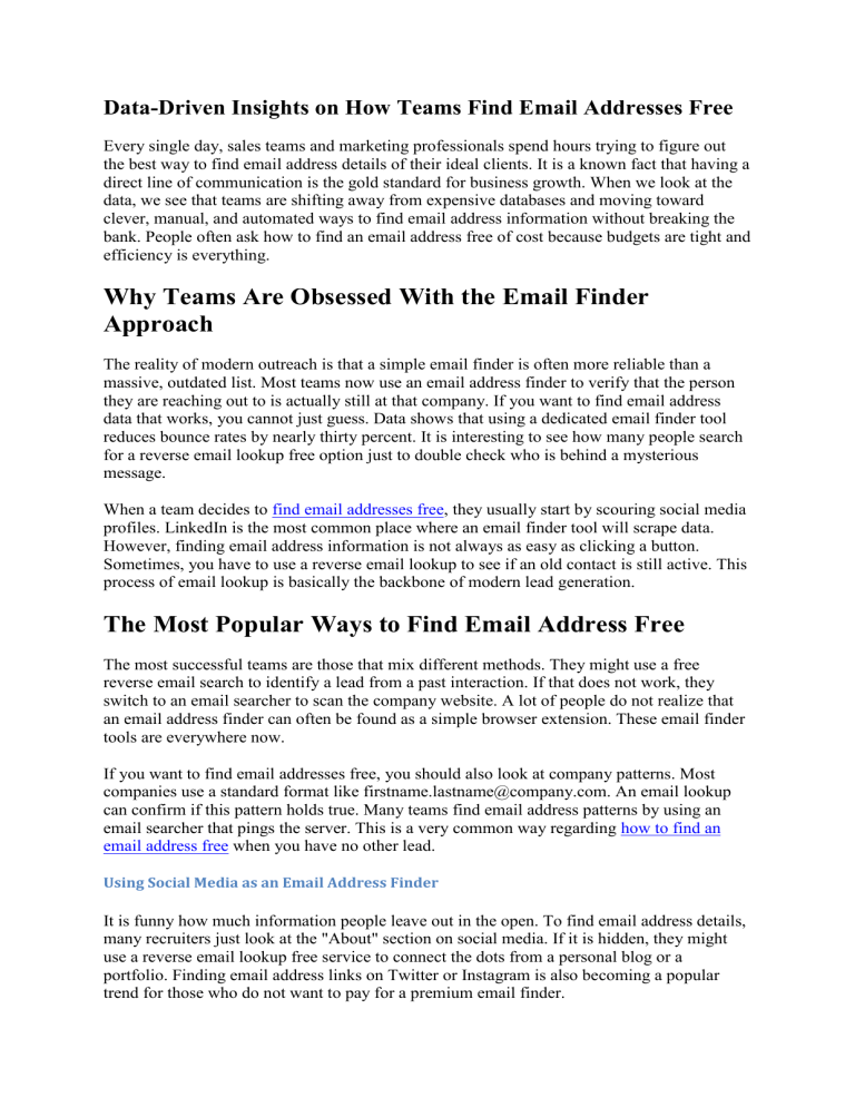 Data-Driven Insights on How Teams Find Email Addresses Free Every single day, sales teams and marketing professionals spend hours trying to figure out the best way to find email address details of their ideal clients. It is a known fact that having a direct line of communication is the gold standard for business growth. When we look at the data, we see that teams are shifting away from expensive databases and moving toward clever, manual, and automated ways to find email address information without breaking the bank. People often ask how to find an email address free of cost because budgets are tight and efficiency is everything. Why Teams Are Obsessed With the Email Finder Approach The reality of modern outreach is that a simple email finder is often more reliable than a massive, outdated list. Most teams now use an email address finder to verify that the person they are reaching out to is actually still at that company. If you want to find email address data that works, you cannot just guess. Data shows that using a dedicated email finder tool reduces bounce rates by nearly thirty percent. It is interesting to see how many people search for a reverse email lookup free option just to double check who is behind a mysterious message. When a team decides to find email addresses free, they usually start by scouring social media profiles. LinkedIn is the most common place where an email finder tool will scrape data. However, finding email address information is not always as easy as clicking a button. Sometimes, you have to use a reverse email lookup to see if an old contact is still active. This process of email lookup is basically the backbone of modern lead generation. The Most Popular Ways to Find Email Address Free The most successful teams are those that mix different methods. They might use a free reverse email search to identify a lead from a past interaction. If that does not work, they switch to an email searcher to scan the company website. A lot of people do not realize that an email address finder can often be found as a simple browser extension. These email finder tools are everywhere now. If you want to find email addresses free, you should also look at company patterns. Most companies use a standard format like firstname.lastname@company.com. An email lookup can confirm if this pattern holds true. Many teams find email address patterns by using an email searcher that pings the server. This is a very common way regarding how to find an email address free when you have no other lead. Using Social Media as an Email Address Finder It is funny how much information people leave out in the open. To find email address details, many recruiters just look at the "About" section on social media. If it is hidden, they might use a reverse email lookup free service to connect the dots from a personal blog or a portfolio. Finding email address links on Twitter or Instagram is also becoming a popular trend for those who do not want to pay for a premium email finder. The data suggests that teams which use more than one email finder tool have a higher success rate. You cannot rely on just one email searcher because the web is too big. Sometimes an email lookup will fail on one site but work on another. This is why having a diverse set of email finder tools is vital for any team that needs to find email address information quickly. The Rise of the Reverse Email Lookup We are seeing a huge spike in the use of reverse email lookup free tools. Why is this? It is because people get emails from unknown senders and they need an email lookup to verify the identity. A reverse email lookup helps in making sure you are not talking to a bot. If you are trying to find email addresses free, you might also find yourself doing a free reverse email search to clean up your own mailing list. An email address finder is not just for cold sales. It is also for networking. When you want to find email address data for a high level executive, a reverse email lookup can tell you if the address you have is their personal one or a generic office one. This kind of email lookup is what separates the pros from the beginners. How to Find an Email Address Free Without Losing Time Efficiency is the biggest hurdle. You can spend all day trying to find email address after email address and have nothing to show for it. Smart teams use an email searcher that automates the boring parts. Even when they want to find email addresses free, they use the free tiers of professional email finder tools. This gives them the power of a paid email address finder without the cost. Finding email address data is ultimately about persistence. You might try an email lookup and get no results. Then you try a reverse email lookup free tool and suddenly you have the name and the company. The goal is to find email address contacts that actually reply. Using a free reverse email search can sometimes give you more context than a simple search. Final Thoughts on Email Finder Tools In conclusion, the data shows that the best way to find email address leads is to be curious. Whether you use an email finder, a reverse email lookup, or a basic email searcher, the information is out there. Most people who want to find email addresses free end up using a combination of manual searching and email finder tools. If you are wondering how to find an email address free, start with the basics. Use an email lookup for the company domain. Use a reverse email lookup free for the individual. Eventually, you will find email address patterns that work for your specific industry. The world of the email address finder is always changing, but the need to find email address details will always be there for growing teams. Use every email searcher and free reverse email search available to you, and you will see your response rates go up.