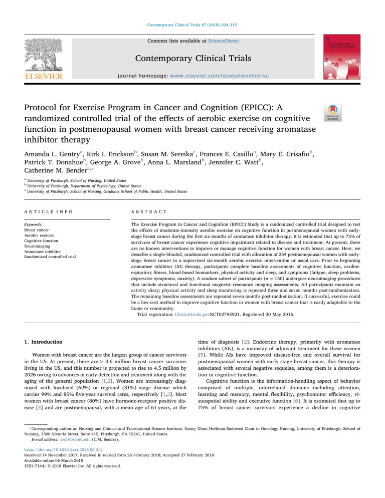 Contemporary Clinical Trials 67 (2018) 109–115 Contents lists available at ScienceDirect Contemporary Clinical Trials journal homepage: www.elsevier.com/locate/conclintrial Protocol for Exercise Program in Cancer and Cognition (EPICC): A randomized controlled trial of the effects of aerobic exercise on cognitive function in postmenopausal women with breast cancer receiving aromatase inhibitor therapy T Amanda L. Gentrya, Kirk I. Ericksonb, Susan M. Sereikac, Frances E. Casilloa, Mary E. Crisafiob, Patrick T. Donahueb, George A. Groveb, Anna L. Marslandb, Jennifer C. Wattb, ⁎ Catherine M. Bendera, a University of Pittsburgh, School of Nursing, United States University of Pittsburgh, Department of Psychology, United States c University of Pittsburgh, School of Nursing, Graduate School of Public Health, United States b A R T I C LE I N FO A B S T R A C T Keywords: Breast cancer Aerobic exercise Cognitive function Neuroimaging Aromatase inhibitor Randomized controlled trial The Exercise Program in Cancer and Cognition (EPICC) Study is a randomized controlled trial designed to test the effects of moderate-intensity aerobic exercise on cognitive function in postmenopausal women with earlystage breast cancer during the first six months of aromatase inhibitor therapy. It is estimated that up to 75% of survivors of breast cancer experience cognitive impairment related to disease and treatment. At present, there are no known interventions to improve or manage cognitive function for women with breast cancer. Here, we describe a single-blinded, randomized controlled trial with allocation of 254 postmenopausal women with earlystage breast cancer to a supervised six-month aerobic exercise intervention or usual care. Prior to beginning aromatase inhibitor (AI) therapy, participants complete baseline assessments of cognitive function, cardiorespiratory fitness, blood-based biomarkers, physical activity and sleep, and symptoms (fatigue, sleep problems, depressive symptoms, anxiety). A random subset of participants (n = 150) undergoes neuroimaging procedures that include structural and functional magnetic resonance imaging assessments. All participants maintain an activity diary; physical activity and sleep monitoring is repeated three and seven months post-randomization. The remaining baseline assessments are repeated seven months post-randomization. If successful, exercise could be a low-cost method to improve cognitive function in women with breast cancer that is easily adaptable to the home or community. Trial registration: Clinicaltrials.govNCT02793921. Registered 20 May 2016. 1. Introduction Women with breast cancer are the largest group of cancer survivors in the US. At present, there are > 3.6 million breast cancer survivors living in the US, and this number is projected to rise to 4.5 million by 2026 owing to advances in early detection and treatment along with the aging of the general population [1,2]. Women are increasingly diagnosed with localized (62%) or regional (31%) stage disease which carries 99% and 85% five-year survival rates, respectively [1,3]. Most women with breast cancer (80%) have hormone-receptor positive disease [4] and are postmenopausal, with a mean age of 61 years, at the time of diagnosis [2]. Endocrine therapy, primarily with aromatase inhibitors (AIs), is a mainstay of adjuvant treatment for these women [5]. While AIs have improved disease-free and overall survival for postmenopausal women with early stage breast cancer, this therapy is associated with several negative sequelae, among them is a deterioration in cognitive function. Cognitive function is the information-handling aspect of behavior comprised of multiple, interrelated domains including attention, learning and memory, mental flexibility, psychomotor efficiency, visuospatial ability and executive function [6]. It is estimated that up to 75% of breast cancer survivors experience a decline in cognitive ⁎ Corresponding author at: Nursing and Clinical and Translational Science Institute, Nancy Glunt Hoffman Endowed Chair in Oncology Nursing, University of Pittsburgh, School of Nursing, 3500 Victoria Street, Suite 415, Pittsburgh, PA 15261, United States. E-mail address: cbe100@pitt.edu (C.M. Bender). https://doi.org/10.1016/j.cct.2018.02.012 Received 14 November 2017; Received in revised form 26 February 2018; Accepted 27 February 2018 Available online 06 March 2018 1551-7144/ © 2018 Elsevier Inc. All rights reserved. Contemporary Clinical Trials 67 (2018) 109–115 A.L. Gentry et al. function [7] which may be short-term or persist years beyond completion of treatment [8,9]. While the cognitive decline is typically mild or moderate, and does not meet clinical criteria for dementia, it can negatively impact survivors' ability to perform everyday tasks as well as long-term quality of life, occupational achievement, development and maintenance of social relationships, appropriate self-care and treatment adherence [10,11]. Reductions in concentration, working memory and executive function have been observed with endocrine therapy. Furthermore, there is evidence that, compared to age and education-matched women without breast cancer, some women with breast cancer experience poorer cognitive function prior to beginning systemic adjuvant therapy [12–14]. Specifically, results from a large, longitudinal cohort study of postmenopausal women with early-stage breast cancer show decline in working memory and concentration during the first six months of AI therapy in women who received anastrozole with or without chemotherapy. Compared to age- and education-matched controls, women with breast cancer also had poorer executive function prior to beginning systemic adjuvant therapy and at six-months post-initiation of AI treatment [12]. In postmenopausal women with breast cancer, multiple disease and treatment-related factors, including estradiol reduction, cytokine dysregulation along with common co-occurring symptoms su