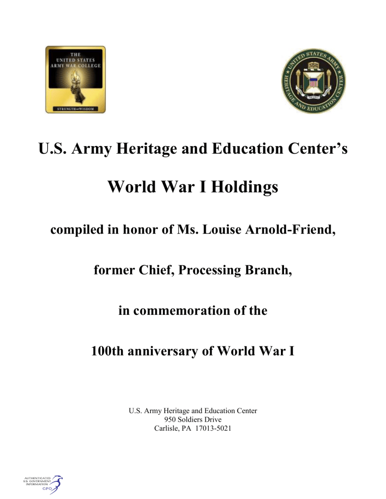 U.S. Army Heritage and Education Center’s World War I Holdings compiled in honor of Ms. Louise Arnold-Friend, former Chief, Processing Branch, in commemoration of the 100th anniversary of World War I U.S. Army Heritage and Education Center 950 Soldiers Drive Carlisle, PA 17013-5021 Preface Wars, at least those wars waged and documented since the beginning of recorded history, usually are fought at least twice: once on the battlefield and again, for what often seems like an eternity, in oral tradition, written text and imagery. The era of the Great War (1914-1918), perhaps better known by today’s generation as World War I, certainly is no exception. In addition to the voluminous archival sources housed in both public and private repositories, that document the activities of virtually every nation during the war, there also exists a substantial, rich and diverse textual and photographic record on virtually every aspect of the conflict. Participants, both combatants and noncombatants alike, wrote letters home or to friends; collected or took images of equipment, their fellow soldiers, the places where they fought or visited, and of the the sheer destruction caused by the war. Likewise, they often kept detailed accounts of their many and varied activities or expressed deeply personal feelings in their diaries and memoirs. In addition, some participants crafted artwork (often called trench art), or carved epitaphs on battle debris or, in some cases, even on the walls and beams inside their trench shelters and command posts. This diversity of contemporary material has been utilized by historians, family researchers and educators alike, to create layers and layers of interpretative literature regarding the war and its significance. Oftentimes, folks can better understand their family’s heritage or the current state of the world by utilizing these primary and secondary sources pertaining to the Great War (World War I). What follows is a substantial compilation of source materials which forms the basis of a Finding Aid for users to explore the diverse and ever growing holdings of the US Army Military History Institute (MHI) and the US Army War College Library (AWCL), both of which are now components of the US Army Heritage and Education Center (USAHEC). The majority of the holdings focus on, but are not restricted to, materials that document the American Expeditionary Forces’ (AEF) participation in what is often referred to as the “War to End All Wars.” However, all fronts and all participants, both friend and foe alike, also are covered in some depth. By their very nature, Finding Aids are obsolete at the moment of their creation, as new materials are arriving constantly and being added to the USAHEC’s holdings. Still, both the MHI, responsible for archival and photographic materials, and the AWCL, responsible for published and periodical materials, have a long and proud history of maintaining updated bibliographic Finding Aids. Thus, primarily through the use of innovative technology, it is hoped that this document will be updated on a recurring basis so as to remain current for both on-site and off-site users. Louise Arnold-Friend Former MHI Senior Librarian and Chief, Processing Branch, now retired i Acknowledgements An undertaking of this magnitude is not simply the product of the compiler. Rather, it is the result of the hard work and dedicated service of a number of first MHI, and now Library Division staff members, both past and present. Accordingly, it gives me personal pleasure to commend individual staff members who played a major role in the creation of this finding aid. The original creation of the individual World War I-related Reference Bibliographies that represent the heart and soul of this document is the result primarily of former MHI staff members, Mr. John Slonaker, Mr. Dennis Vetock and Ms. Louise Arnold-Friend, all of whom have since retired. Likewise, the development and implementation of the World War I Veterans Survey in the mid-1970s relied heavily on the leadership and organizational skills of both Dr. Richard Sommers and Mr. David Keough, again, both of whom have since retired. The efforts of these five former MHI staff members and many others, form the foundation for this revised and expanded World War I finding aid. In terms of the actual compiling of this document, there are, again, many to thank, starting with Colonel Matthew Q. Dawson, former director of the USAHEC and now Director, Center for Strategic Leadership and Development. It was his parting guidance that he wanted each USAHEC division to publish a substantive document on a yearly basis that led to this undertaking, although I suspect the end product is not entirely what he had in mind. I also must highlight the USAHEC’s Library Division for whom I presently serve as a volunteer. Had it not been for the willingness and cooperation of the Library Director, Dr. Stephen D. Crocco, and my immediate supervisor, Ms. Lori M. Sekela, supporting this undertaking, it never would have seen the light of day. And, it came at a price-over 800 hours of labor that could be been applied to their many other tasks. In addition to Dr. Crocco and Ms. Sekela, I also wish to thank Ms. Lisa M. Briner for her constant support and quick cataloging of World War I-related periodicals. Likewise, with regard to unit histories, I wish to extend my thanks and appreciation to Ms. Roberta A. Berthelot. Perhaps more importantly, Lori, Lisa and Roberta completely altered this historian’s long-standing views with regard to Army librarians. Their professionalism and dedication to the USAHEC’s mission are the primary reasons I became a volunteer with the Library Division. I also wish to highlight the digitization support provided by Mr. Gary L. Johnson, and commend Mr. Stephen “Bloodhound” Bye, who successfully located numerous items that appeared, at first blush, to have been missing from the shelves. Lastly, I wish to