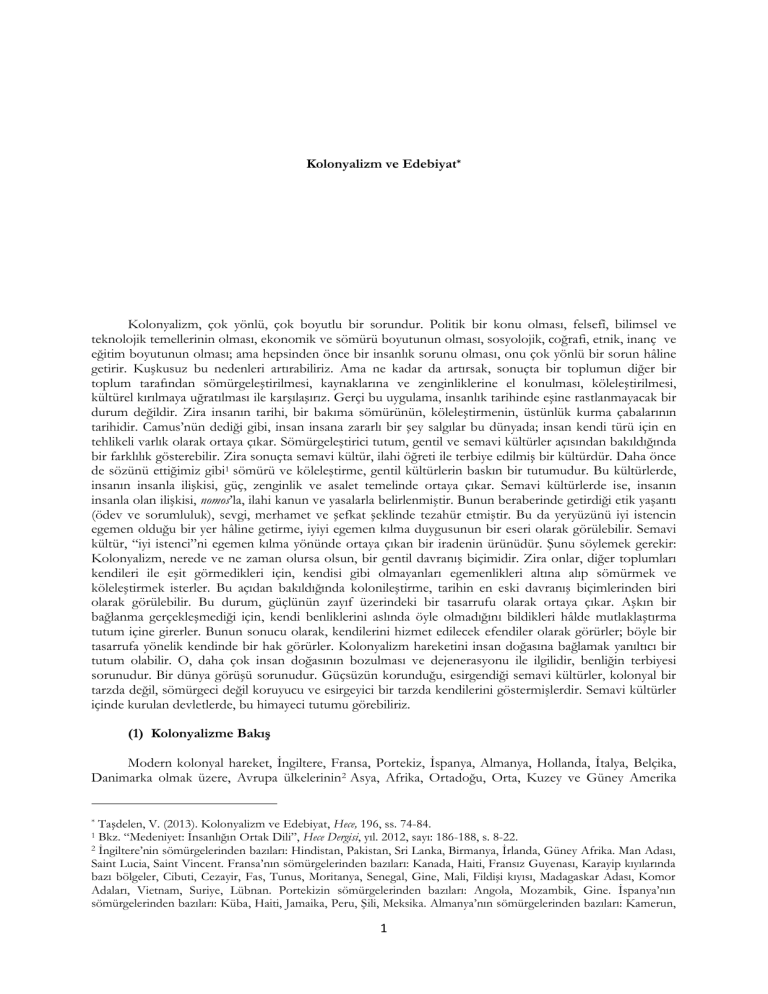 Kolonyalizm ve Edebiyat* Kolonyalizm, çok yönlü, çok boyutlu bir sorundur. Politik bir konu olması, felsefî, bilimsel ve teknolojik temellerinin olması, ekonomik ve sömürü boyutunun olması, sosyolojik, coğrafi, etnik, inanç ve eğitim boyutunun olması; ama hepsinden önce bir insanlık sorunu olması, onu çok yönlü bir sorun hâline getirir. Kuşkusuz bu nedenleri artırabiliriz. Ama ne kadar da artırsak, sonuçta bir toplumun diğer bir toplum tarafından sömürgeleştirilmesi, kaynaklarına ve zenginliklerine el konulması, köleleştirilmesi, kültürel kırılmaya uğratılması ile karşılaşırız. Gerçi bu uygulama, insanlık tarihinde eşine rastlanmayacak bir durum değildir. Zira insanın tarihi, bir bakıma sömürünün, köleleştirmenin, üstünlük kurma çabalarının tarihidir. Camus’nün dediği gibi, insan insana zararlı bir şey salgılar bu dünyada; insan kendi türü için en tehlikeli varlık olarak ortaya çıkar. Sömürgeleştirici tutum, gentil ve semavi kültürler açısından bakıldığında bir farklılık gösterebilir. Zira sonuçta semavi kültür, ilahi öğreti ile terbiye edilmiş bir kültürdür. Daha önce de sözünü ettiğimiz gibi1 sömürü ve köleleştirme, gentil kültürlerin baskın bir tutumudur. Bu kültürlerde, insanın insanla ilişkisi, güç, zenginlik ve asalet temelinde ortaya çıkar. Semavi kültürlerde ise, insanın insanla olan ilişkisi, nomos’la, ilahi kanun ve yasalarla belirlenmiştir. Bunun beraberinde getirdiği etik yaşantı (ödev ve sorumluluk), sevgi, merhamet ve şefkat şeklinde tezahür etmiştir. Bu da yeryüzünü iyi istencin egemen olduğu bir yer hâline getirme, iyiyi egemen kılma duygusunun bir eseri olarak görülebilir. Semavi kültür, “iyi istenci”ni egemen kılma yönünde ortaya çıkan bir iradenin ürünüdür. Şunu söylemek gerekir: Kolonyalizm, nerede ve ne zaman olursa olsun, bir gentil davranış biçimidir. Zira onlar, diğer toplumları kendileri ile eşit görmedikleri için, kendisi gibi olmayanları egemenlikleri altına alıp sömürmek ve köleleştirmek isterler. Bu açıdan bakıldığında kolonileştirme, tarihin en eski davranış biçimlerinden biri olarak görülebilir. Bu durum, güçlünün zayıf üzerindeki bir tasarrufu olarak ortaya çıkar. Aşkın bir bağlanma gerçekleşmediği için, kendi benliklerini aslında öyle olmadığını bildikleri hâlde mutlaklaştırma tutum içine girerler. Bunun sonucu olarak, kendilerini hizmet edilecek efendiler olarak görürler; böyle bir tasarrufa yönelik kendinde bir hak görürler. Kolonyalizm hareketini insan doğasına bağlamak yanıltıcı bir tutum olabilir. O, daha çok insan doğasının bozulması ve dejenerasyonu ile ilgilidir, benliğin terbiyesi sorunudur. Bir dünya görüşü sorunudur. Güçsüzün korunduğu, esirgendiği semavi kültürler, kolonyal bir tarzda değil, sömürgeci değil koruyucu ve esirgeyici bir tarzda kendilerini göstermişlerdir. Semavi kültürler içinde kurulan devletlerde, bu himayeci tutumu görebiliriz. (1) Kolonyalizme Bakış Modern kolonyal hareket, İngiltere, Fransa, Portekiz, İspanya, Almanya, Hollanda, İtalya, Belçika, Danimarka olmak üzere, Avrupa ülkelerinin2 Asya, Afrika, Ortadoğu, Orta, Kuzey ve Güney Amerika * Taşdelen, V. (2013). Kolonyalizm ve Edebiyat, Hece, 196, ss. 74-84. 1 Bkz. “Medeniyet: İnsanlığın Ortak Dili”, Hece Dergisi, yıl. 2012, sayı: 186-188, s. 8-22. 2 İngiltere’nin sömürgelerinden bazıları: Hindistan, Pakistan, Sri Lanka, Birmanya, İrlanda, Güney Afrika. Man Adası, Saint Lucia, Saint Vincent. Fransa’nın sömürgelerinden bazıları: Kanada, Haiti, Fransız Guyenası, Karayip kıyılarında bazı bölgeler, Cibuti, Cezayir, Fas, Tunus, Moritanya, Senegal, Gine, Mali, Fildişi kıyısı, Madagaskar Adası, Komor Adaları, Vietnam, Suriye, Lübnan. Portekizin sömürgelerinden bazıları: Angola, Mozambik, Gine. İspanya’nın sömürgelerinden bazıları: Küba, Haiti, Jamaika, Peru, Şili, Meksika. Almanya’nın sömürgelerinden bazıları: Kamerun, 1 ülkelerini akla gelebilecek tüm zenginlikleriyle kapsamlı ve sistematik bir şekilde sömürge hâline getirmeleri anlamına gelir. 1500’lü yıllardan itibaren İspanya’nın Amerika kıtasının kimi bölgelerini sömürgeleştirmesi, onların zenginliklerine, altın ve mücevherlerine el koyması, modern kolonyal hareketin başlangıcını oluşturur. Kolonileştirme, bir sömürü biçimi olarak insanın bulunduğu her yerde olagelmiştir. Koloninin hafif anlamından ağır anlamına doğru, bir farklılaşma söz konusudur. Tarih boyunca görülen kolonileştirme hareketleri, zor ve güç kullanarak bir toplumun zenginliğine, hayatına ve bedenine el koymanın yanı sıra, ticari ilişkiler için de kullanılmıştır. Fenikelilerin Akdeniz, Ege ve Karadeniz kıyılarında kurdukları koloniler, daha çok ticari amaçlı yerleşim ve uğrak yerleridir. Antik Yunan ve Roma’nın Akdeniz, Ege ve Karadeniz kıyılarında kolonileri vardı. Pusulanın bulunması ve coğrafi keşiflerle birlikte, dünyanın büyük bir kısmını koloni hâline getirecek yollar da açılmış oldu. Yeni ulaşım araçlarının icadı, silah teknolojisinin geliştirilmesi, koloni hareketini kolaylaştırdı ve hızlandırdı. Modern Kolonyal hareket, kapsamlı ve sistematik bir harekettir. Sömürünün kapsamlı ve sistematik olması, onun bir ontolojisinin, epistemolojisinin, teknolojisinin ve bütün bunlarla birlikte bir felsefesinin olması demektir. Batı kültürü, doğu kültürünün geriliği, ilkelliği, barbarlığı, cehaleti yönünde bir söylem geliştirirken, modern bilimi ortaya çıkarmanın, onu giderek teknolojiye dönüştürmenin özgüveni ile dünyanın kahir ekseriyetini yönetme, yönlendirme ve kaynaklarına el koyma hakkını kendisinde görmüştür. Burada “kendisi” ve “kendisi gibi olmayan” arasında bir ayrım