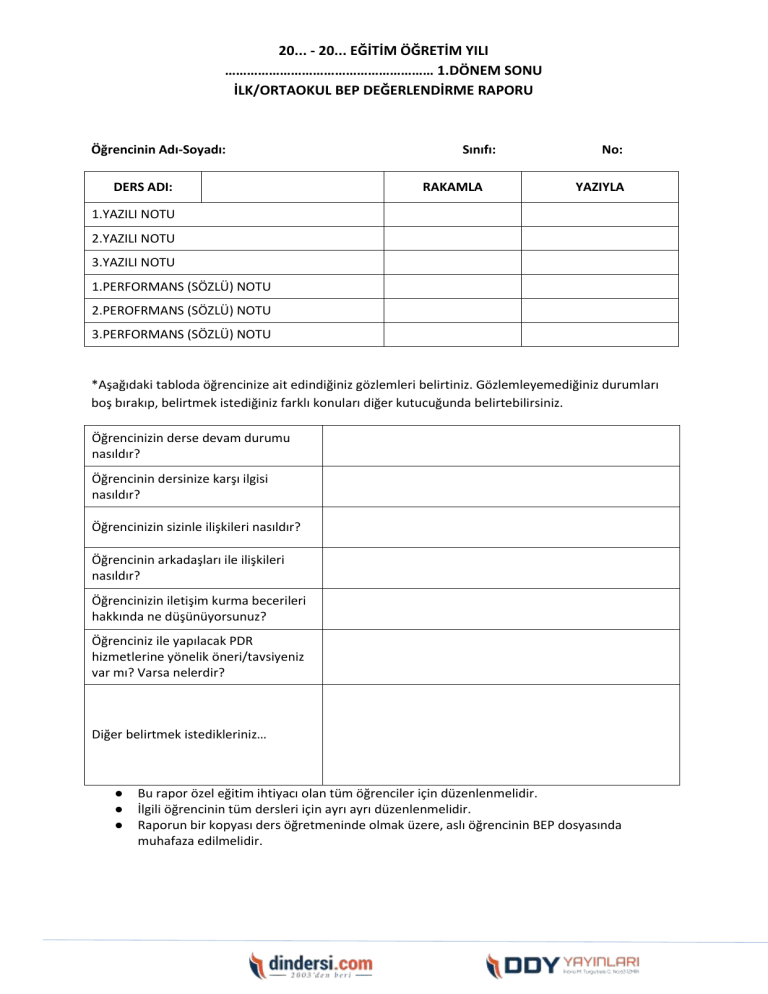20... - 20... EĞİTİM ÖĞRETİM YILI ………………………………………………… 1.DÖNEM SONU İLK/ORTAOKUL BEP DEĞERLENDİRME RAPORU Öğrencinin Adı-Soyadı: DERS ADI: Sınıfı: RAKAMLA No: YAZIYLA 1.YAZILI NOTU 2.YAZILI NOTU 3.YAZILI NOTU 1.PERFORMANS (SÖZLÜ) NOTU 2.PEROFRMANS (SÖZLÜ) NOTU 3.PERFORMANS (SÖZLÜ) NOTU *Aşağıdaki tabloda öğrencinize ait edindiğiniz gözlemleri belirtiniz. Gözlemleyemediğiniz durumları boş bırakıp, belirtmek istediğiniz farklı konuları diğer kutucuğunda belirtebilirsiniz. Öğrencinizin derse devam durumu nasıldır? Öğrencinin dersinize karşı ilgisi nasıldır? Öğrencinizin sizinle ilişkileri nasıldır? Öğrencinin arkadaşları ile ilişkileri nasıldır? Öğrencinizin iletişim kurma becerileri hakkında ne düşünüyorsunuz? Öğrenciniz ile yapılacak PDR hizmetlerine yönelik öneri/tavsiyeniz var mı? Varsa nelerdir? Diğer belirtmek istedikleriniz… ● ● ● Bu rapor özel eğitim ihtiyacı olan tüm öğrenciler için düzenlenmelidir. İlgili öğrencinin tüm dersleri için ayrı ayrı düzenlenmelidir. Raporun bir kopyası ders öğretmeninde olmak üzere, aslı öğrencinin BEP dosyasında muhafaza edilmelidir. *Aşağıdaki tabloda BEP Geliştirme Birimi’nde onaylanmış olan dersinize ait bireyselleştirilmiş eğitim planınızda yer alan kazanımların değerlendirmesini yapınız. GELİŞİM ALANI (Kazanımlar, Amaçlar) BAŞARILI GELİŞTİ BAŞARISIZ AÇIKLAMA …. / ... / 20... ……………………………………………….. Öğretmeni …………………………………………… BEP Geliştirme Birim Başkanı (Muvatta, Kader, 3) DİĞER DÖKÜMANLAR İÇİN TIKLAYINIZ Google Play (Android) İçin Tıklayınız : https://bit.ly/46JM2J4 App Store (iPhone) İçin Tıklayınız : https://bit.ly/3JTK7rz https://bit.ly/46JM2J 4 https://bit.ly/3JTK7rz 4
